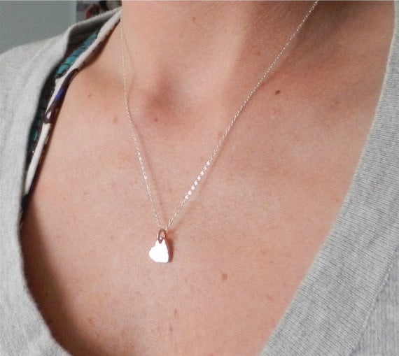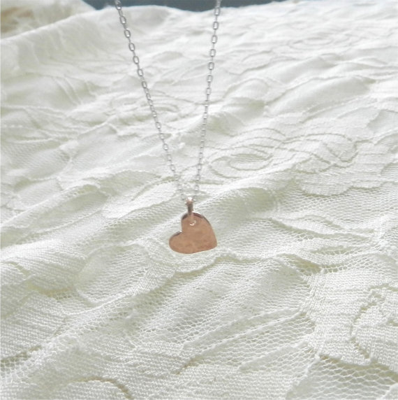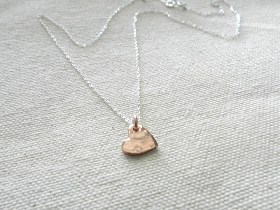 The tiny love necklace is tiny and sweet. The rose gold heart is dappled on one side and shiny on the other and suspended by a glimmering sterling silver chain.