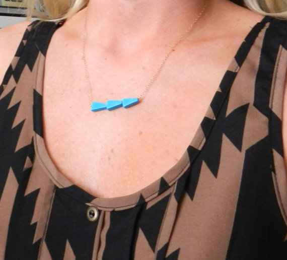 I love this one! Three arrow shaped turquoise beads are wire wrapped to 14k gold filled chain for a modern, fresh necklace.