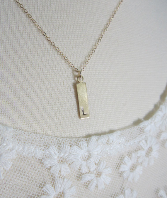 A tiny brass tag personalized with the initial of your choice hangs from delicate gold filled chain.