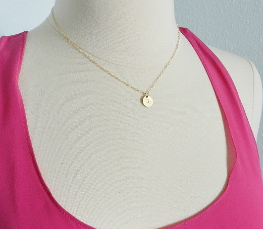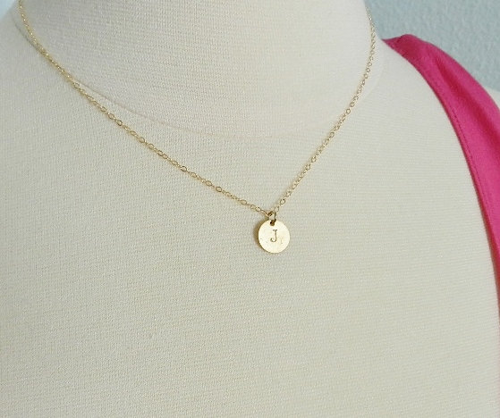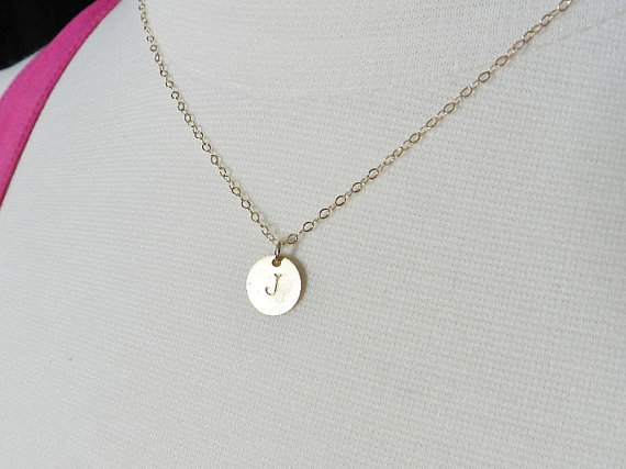 A tiny initial of your choice is hand stamped onto a brass disc for a perfect necklace to wear everyday