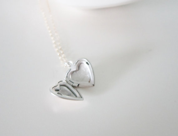 A tiny silver plated heart locket hangs suspended by sterling silver chain for a sweet everyday necklace.