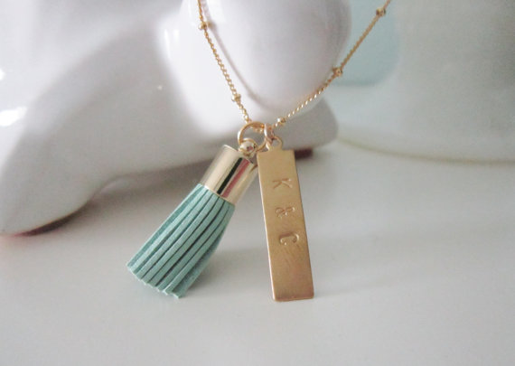 Add a touch of color with this long layering necklace featuring a mint leather tassel and personalized brass bar.