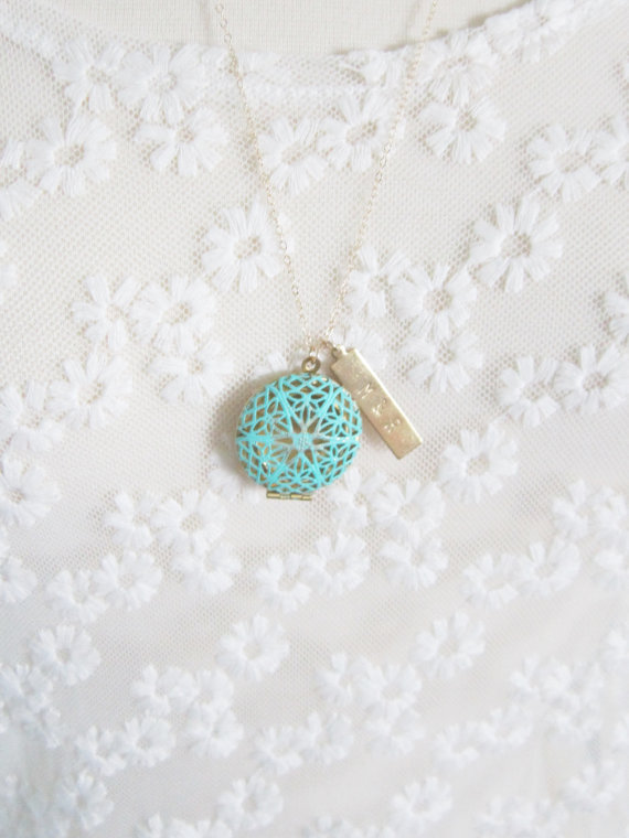 A pretty combination of a turquoise brass locket and a brass bar pendant hanging delicately from gold filled chain