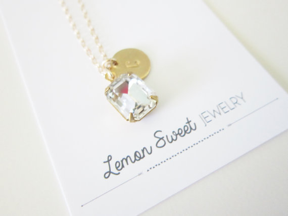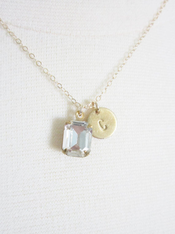 A vintage glass rhinestone and a tiny handstamped initial disc combine for a perfecteveryday necklace with a touch of glam